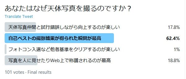 せっかくですので、コメントでいただいたそれらの貴重な意見、天体写真家の皆さんのモチベーションを列記したいと思います。