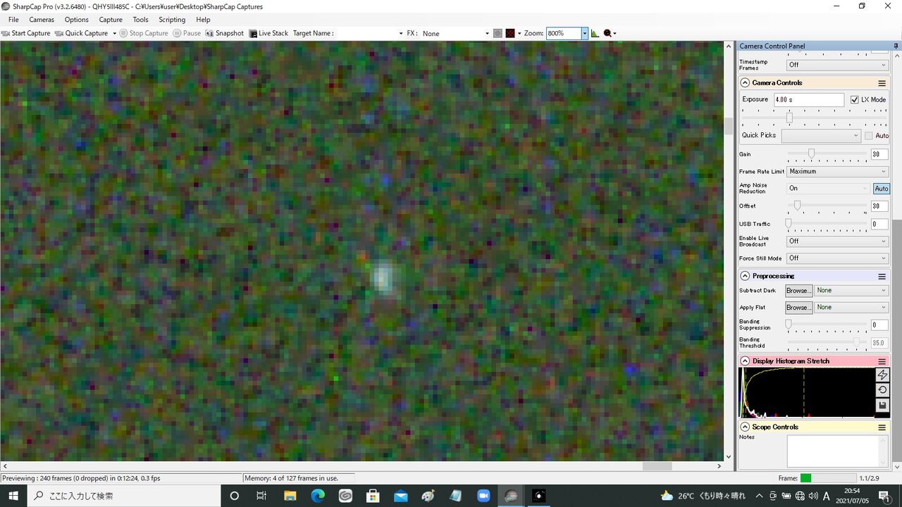 50mmの主鏡に対して40mmの絞りだと、シュミット系におけるケラレのないイメージサークルは、(50-40)/2=5mmとなります。今回使ってるQHY5III485Cの1/1.2"センサーは 。 11.3mmx7.1mmなので、視野の4スミはかなり光量が落ちますね(ピンボケ像が三日月みたいになっている)。