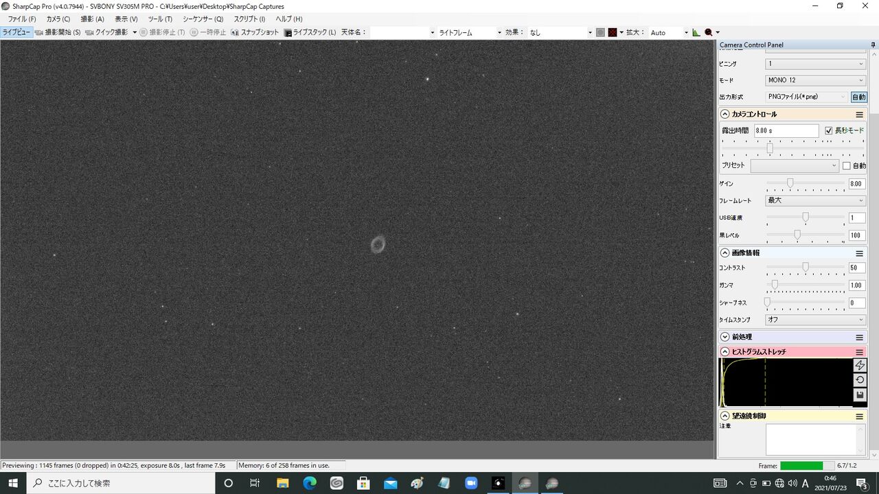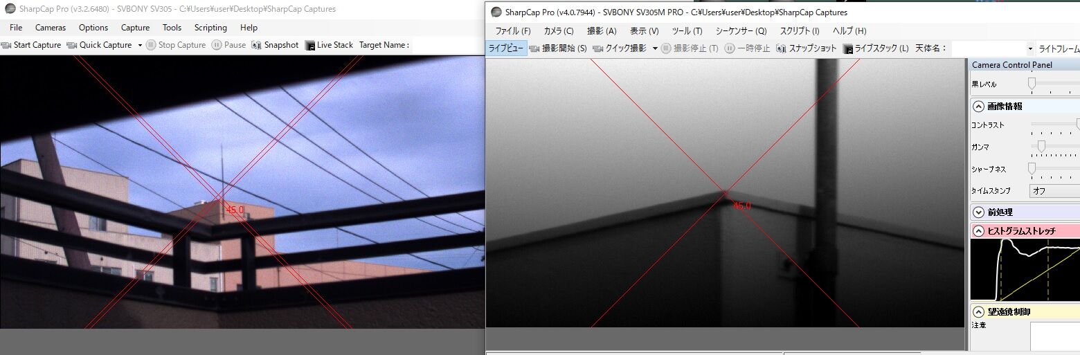 右側のモノクロ画面、SV305MではSharpcapのバージョンが4.0(β版)になってますが、305Mでは4.0を使う必要があります。でも、付属CDにはSharpcap3.2しか入ってないから、ネットでダウンロードしないといけないですね。これ、自分はcokatooさんに教えてもらってたから迷いませんでしたが、予備知識がないとここでつまづくんじゃ、と思います。