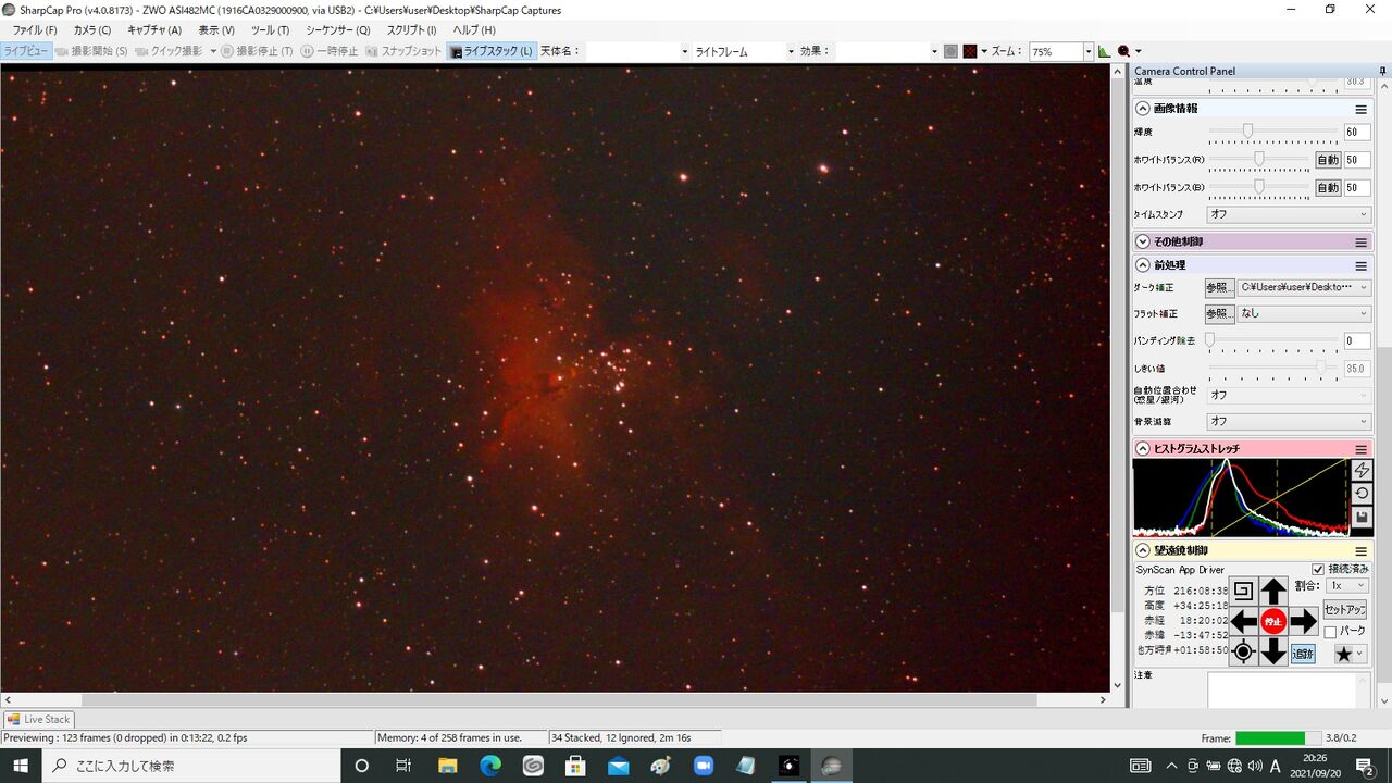 衝撃のファーストライトを展開したASI482MCですが、Sharpcap4.0.8138で使うとこのような挙動を示すことが判明。バージョンを最新の4.0.8173にすることで使用できそうなので今回はこの環境で検証しました。