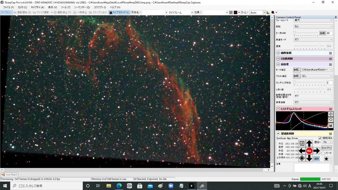 その他、SharpCap4.0.8199での482の使用では、今までより暗いところまで写せてきた感じがしています。