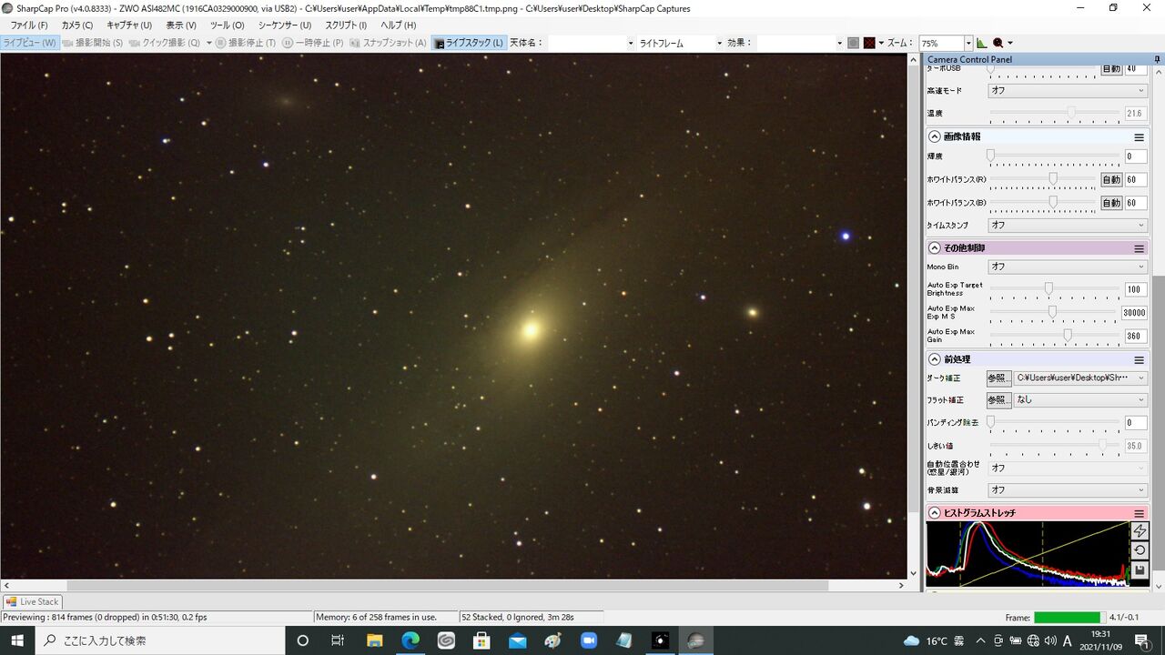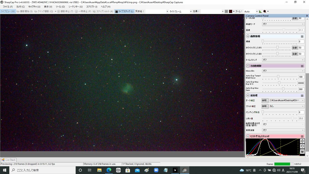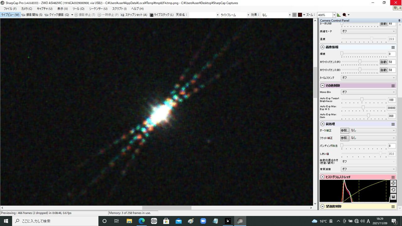 この時点でかなり雲がかかって薄曇り状態。雲の薄そうな南天を狙って見たのですが、全然出せてませんね。SharpCapも昨日更新された最新のv4.0.8333を使っているのですが、それはあんまり関係なさそう(笑)