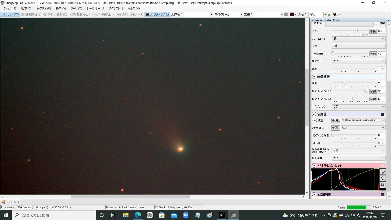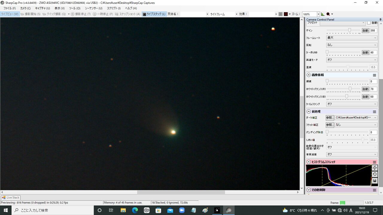 話によれば12月24日現在、さらに3回目のバーストがおこっているそう。なかなか忙しい彗星ですが、西に低くて雲の影響を受けやすいためこのように連続して電視観望で見られたのはラッキーでした。