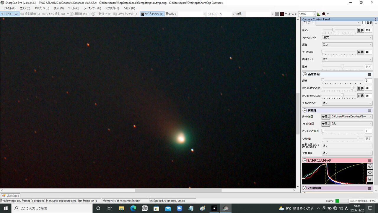 今回地球に接近したレナード彗星はネオワイズ彗星と比べて小さいので、SP140SS鏡筒にASI294MCを取り付けた電視観望で最適な画角。しかもそこそこ天候に恵まれ、何回かにわたって捉えることができました。SP140SS鏡筒にとっては初の”コメットキャッチャーの面目躍如”となっています。