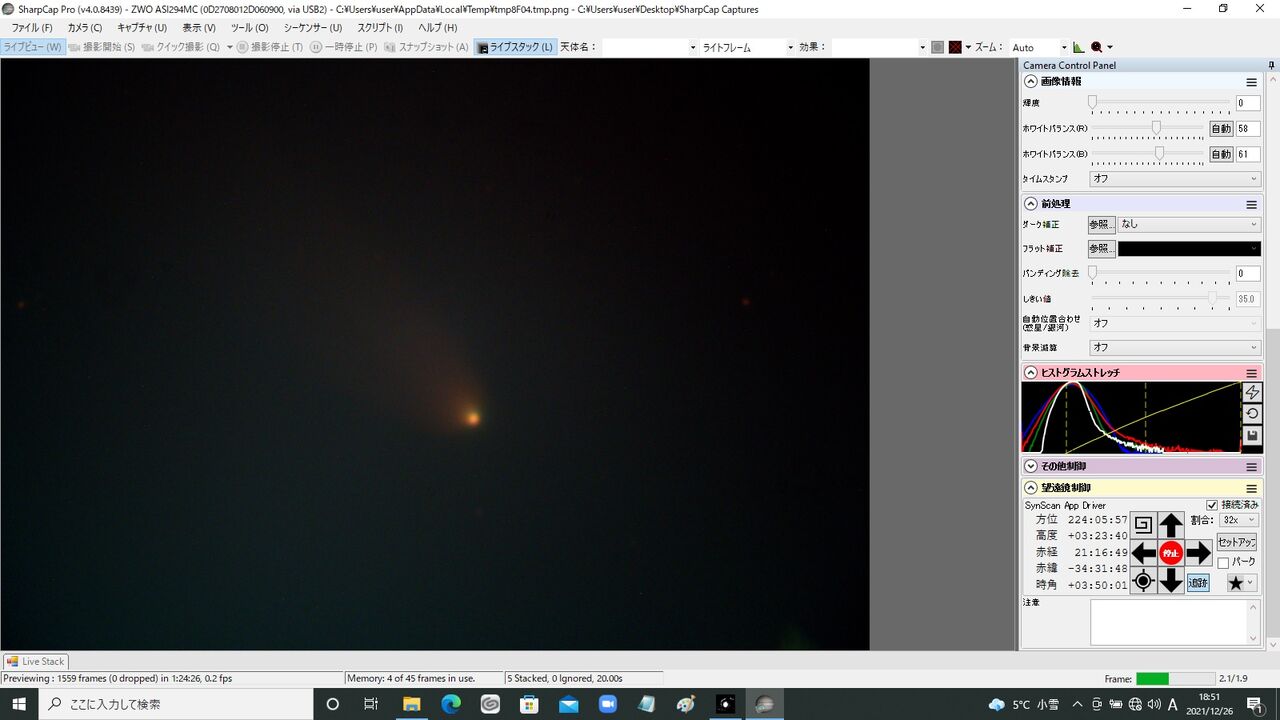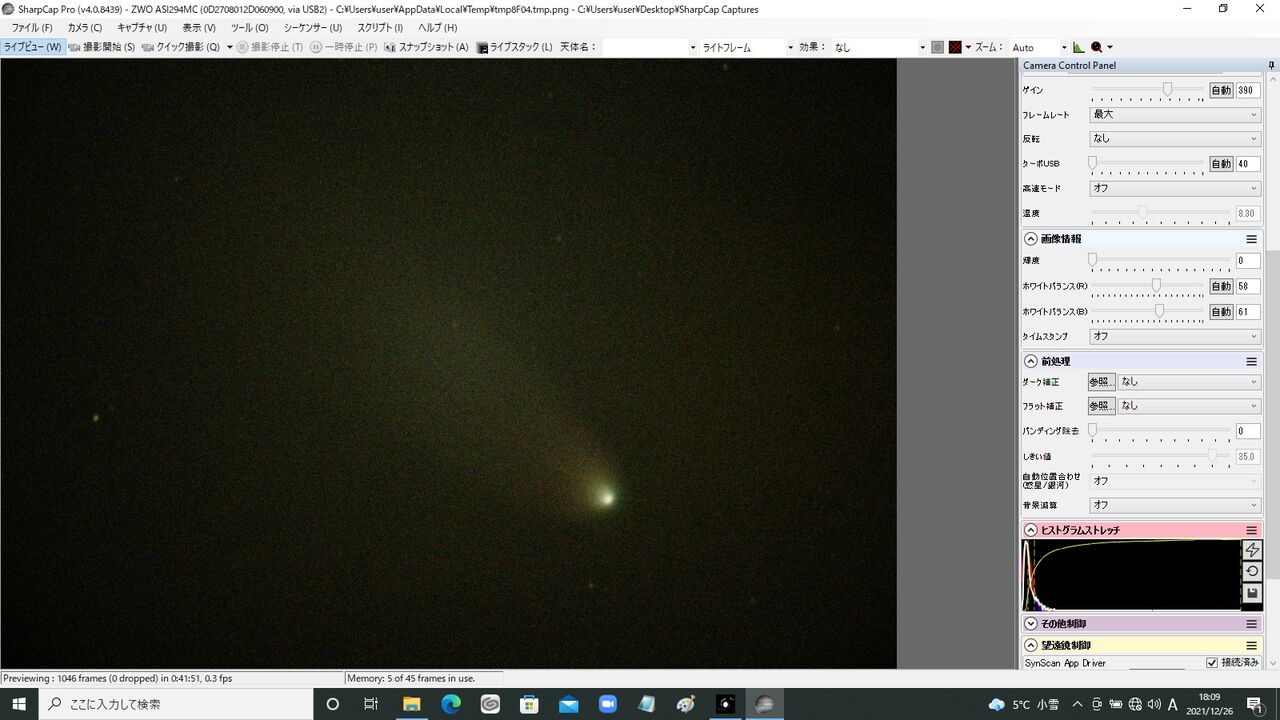 しかし、自宅に居ながらにして最短の準備・観望時間(準備10分、観望18時~19時)で連日にわたって彗星の電視観望をおこなうことができました。長年天文趣味を続けてきた中でも、このように手軽に彗星を観望することは今まで不可能だったのですが、それを可能にした機材環境の進歩は目覚ましいものがありますね。