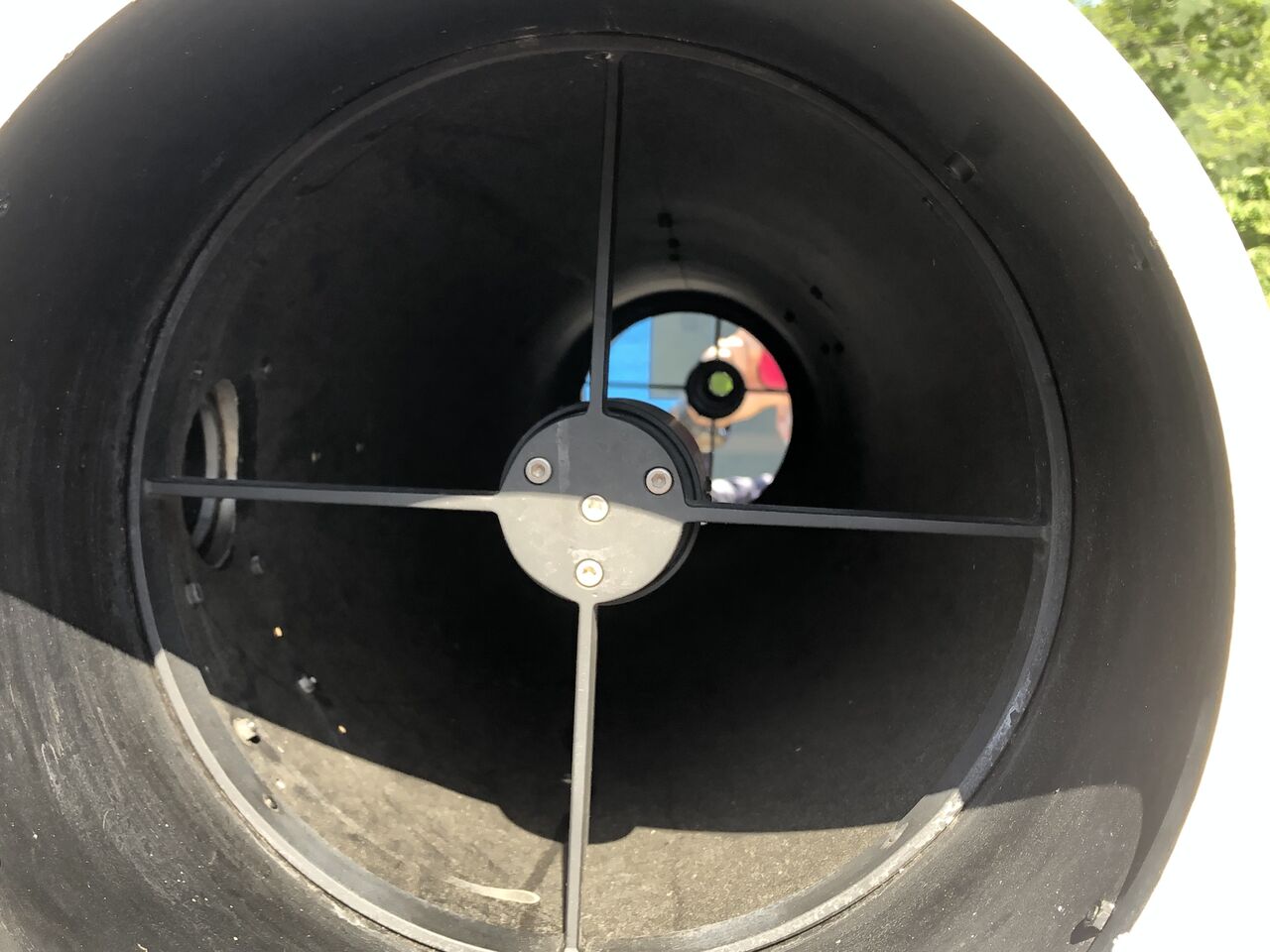筒先から覗き込むと、斜鏡プレート・スパイダー・鏡筒に内接するリングが一体の構造!