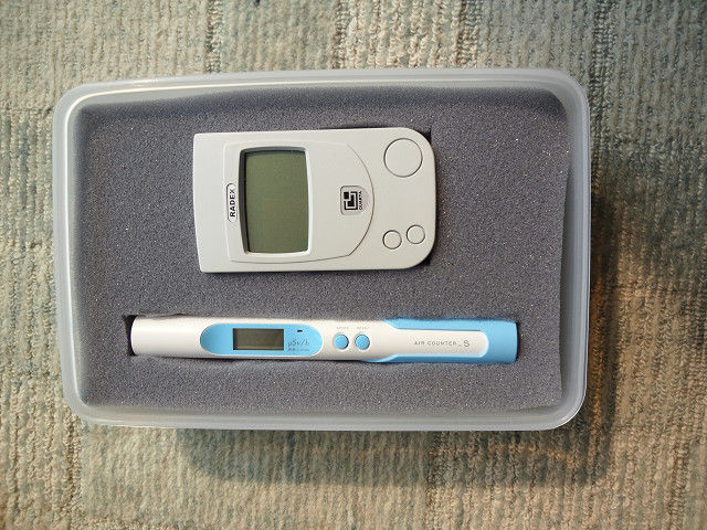上のが、エステーのエアカウンターS、シリコン半導体を使ったやつで「空間線量」を測る予定。