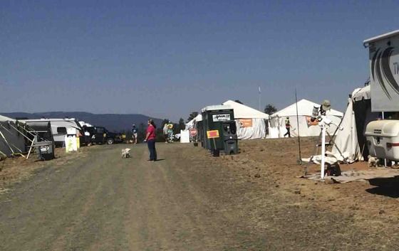 中央に見える緑のやつが移動式のトイレ。その奥の2つのテントの左側がインフォーメーション・テント、右側が受け付けテントです。