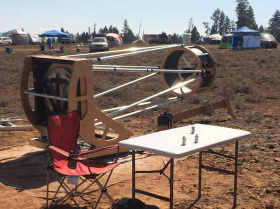 さて、次の写真、右側のラーメン構造をテンションワイヤーで引っ張ったかんじの望遠鏡なんですが・・・・utoさんと、この構造はちょっと厳しいよねーと辛口の評価をしていたところ、製作者と思われる親子が登場。