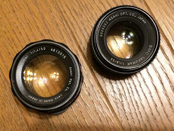 往年の名レンズを2つ出してきました。ペンタックスSMCタクマー、50mmF1.4と55mmF1.8。