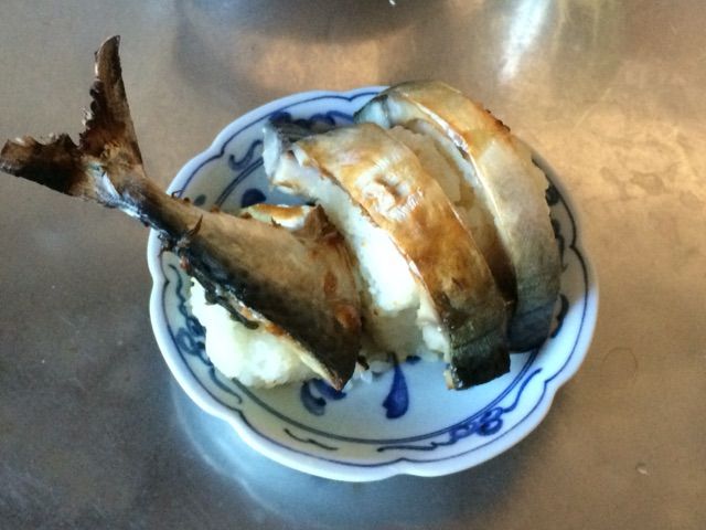 焼かれたサバから出た脂が、酢飯にしみ込んで独特の味になります。