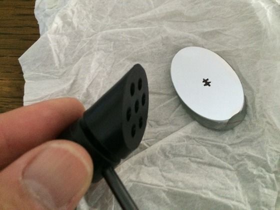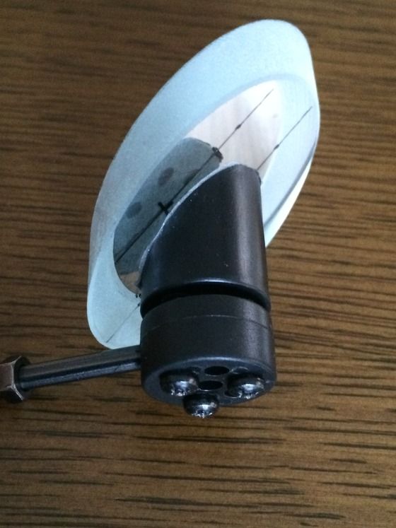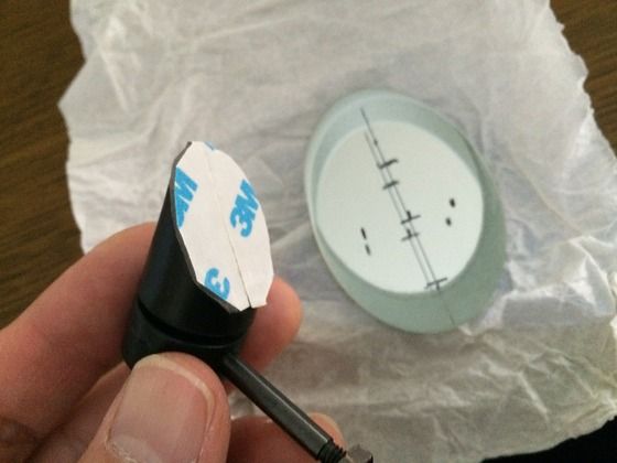 斜鏡ホルダーに両面テープを貼り、位置決めのための線が引いてある40mm斜鏡の裏側に貼り付けます。