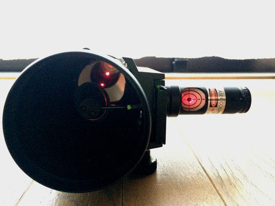 レーザーコリメーターで斜鏡の位置を確かめ、さらに鏡筒に取り付けて主鏡も含めた光軸調整をおこないます。
