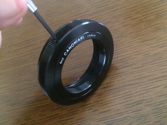 まず、Tマウンの三方のイモネジをゆるめて、T2ネジのついているリングを外します。