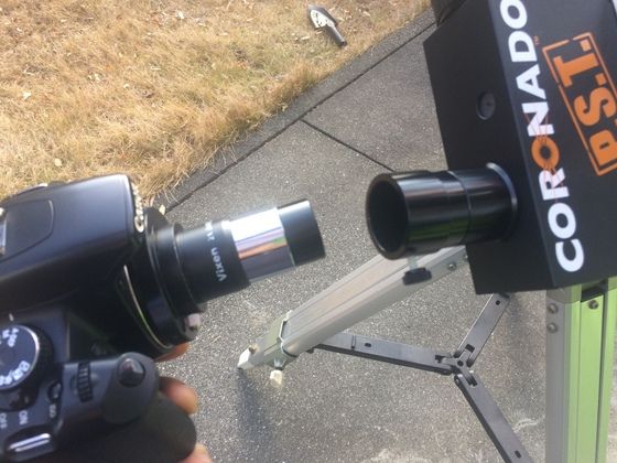 で、アイピースを付けたコリメート状態で写真を撮ろうとするんですがいつも全然太陽表面の模様が写りません。そこで今日はEOS kiss X2 にビクセンのバローTで撮ってみようとしましたが・・・