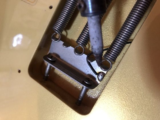 裏側のトレモロ部分につながっている、アース一か所のはんだ付けをやり直すだけでOK。