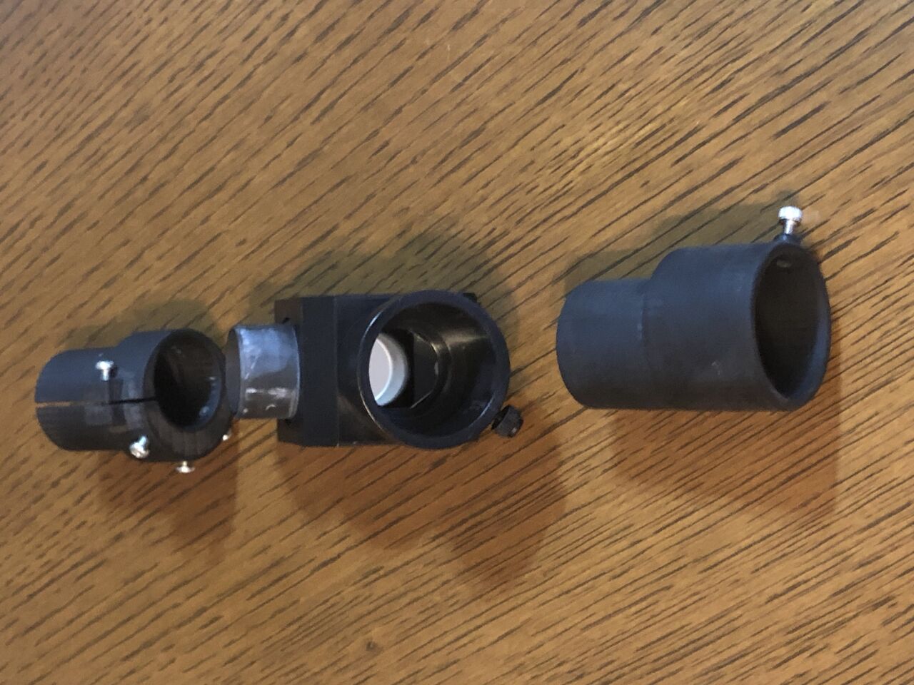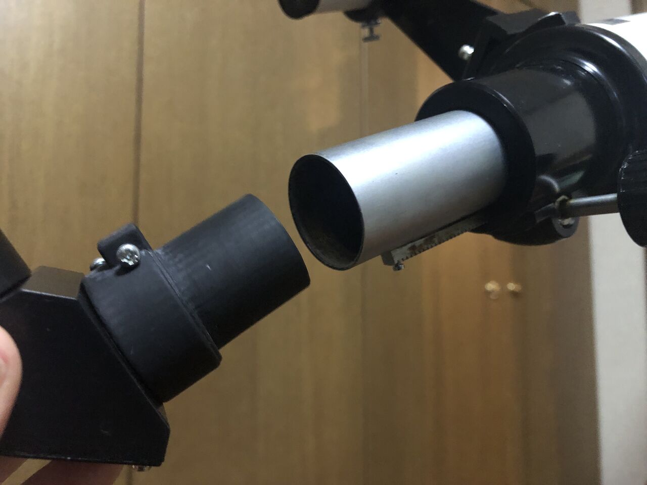 プリズムとアイピースがだいぶ離れていますが、これを近づけてスリーブ内に収まるような位置に置くとプリズム部分で視野の片側がケラれてしまいましたので、プリズムとアイピースの距離を取ることでそれを防ぎました。ドローチューブの繰り出しはギリギリですが、これによりCZJの25-H、36倍の実視界1.3°でもケラれのない視野が実現しています。