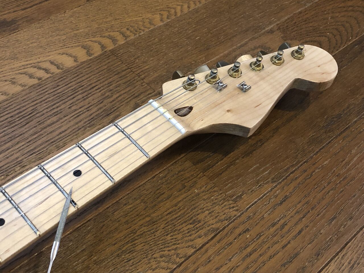 これで何とか六角レンチを突っ込んでネックを弱い順ゾリに。続いて各フレットの音を確かめますがフレット音痴はなさそう。しかし4カ所くらい音の出ないところがありましたので、その部分のフレットを整えます。