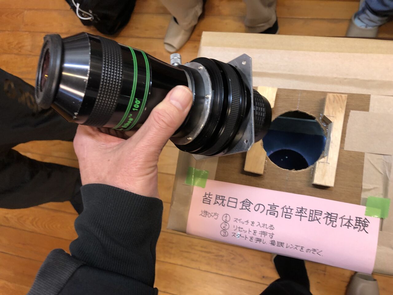 津村さんの「皆既日食高倍率眼視体験」(箱の底の画像をカメラレンズとイーソスを組み合わせて作った3倍? の望遠鏡で見る)