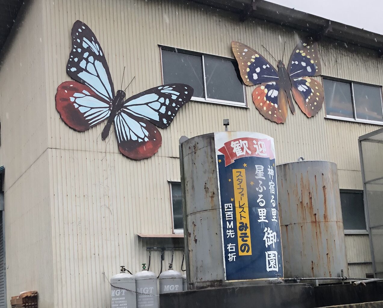 スターフォーレストへ入る道の手前のお蕎麦屋さんの、そまたちょっと手前にこんなのあったんですが、何ですかねこのアサギマダラ? 胡蝶しのぶの館じゃあるまいし(笑)。右側のチョウは何かわからないなあ・・・オオムラサキにしちゃ茶色の部分多いし。しかし去年こんなのあったかな?