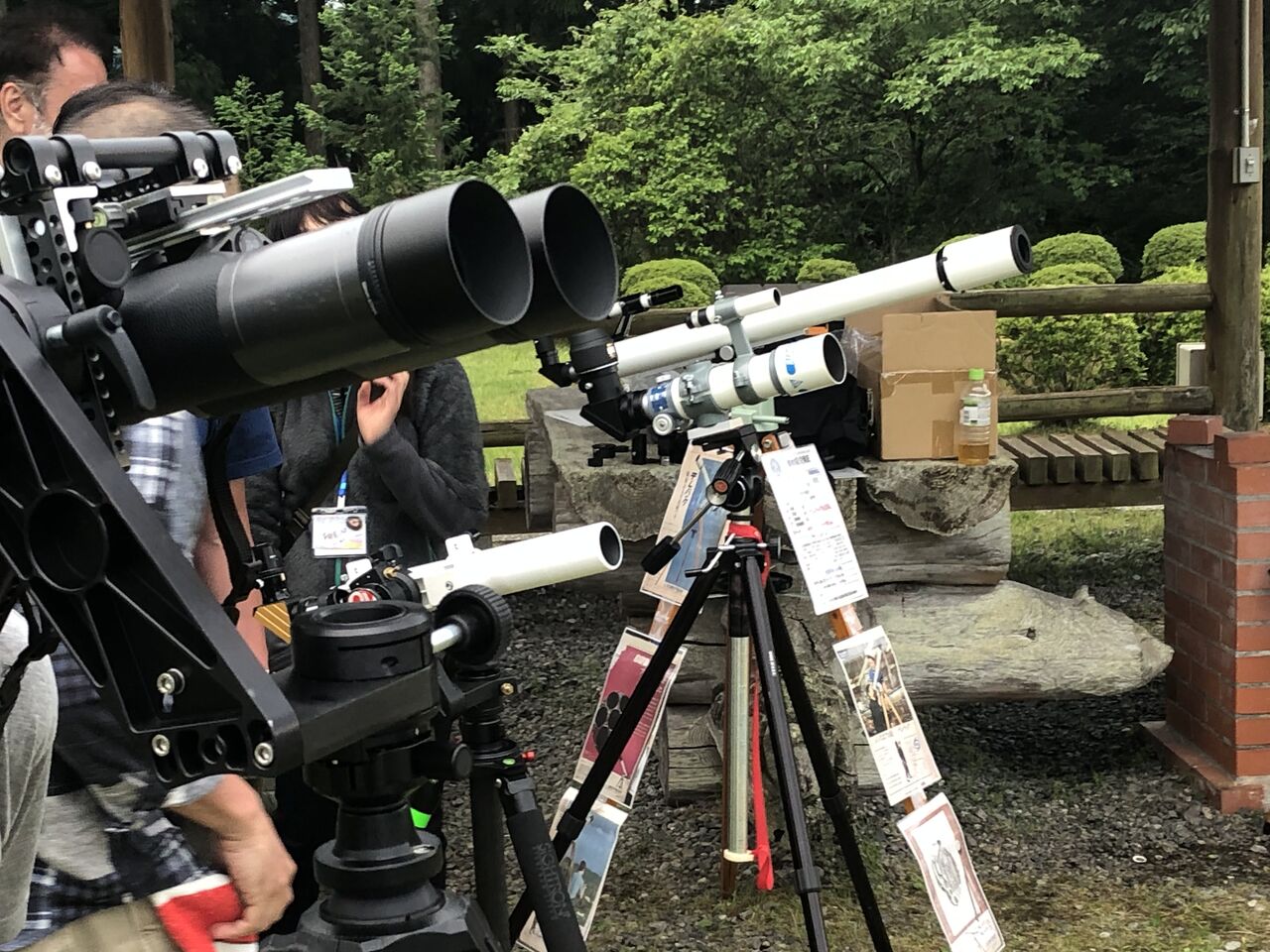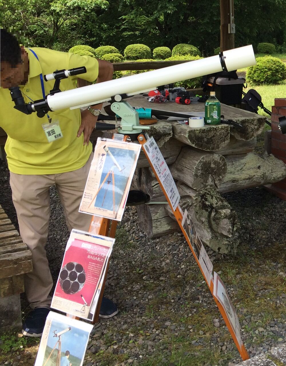 長焦点アクロマートとハイゲンスの組み合わせによる究極のシャープネスを皆さんに見てもらうというのが展示のコンセプトです。しかし望遠鏡を設置した時は気づいてなかったのですが、車で運んだ振動で正立プリズムが少しずれており、2日目の午前中の時点では本来の鋭像ではなかったと思います。上の画像でテレパックを覗いてくれている富田さんも「シベットの野郎、”究極のシャープネス”とか大げさに言ってたけど、それほどじゃないよな?」と思っていたかも(笑)