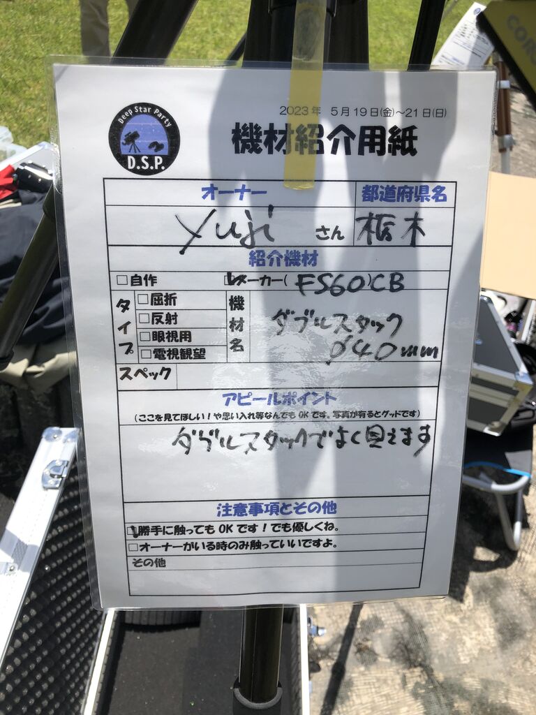 双望会の時代からスターフォーレスト御園でのスターパーティでは受付前の駐車場で太陽望遠鏡が展開されるのが常となっていましたが、今回のDSP2023では雨天のためそれがかないませんでした。