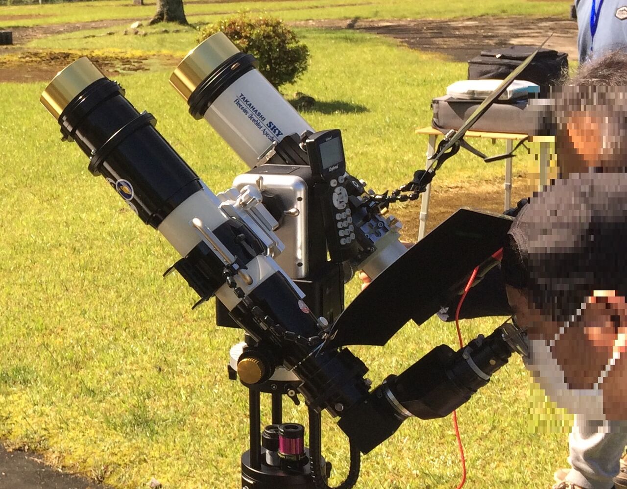 左側の双眼装置が付いた方で太陽の全景、右のほうで部分拡大するんですが、このように2人同時に見ることもできます。