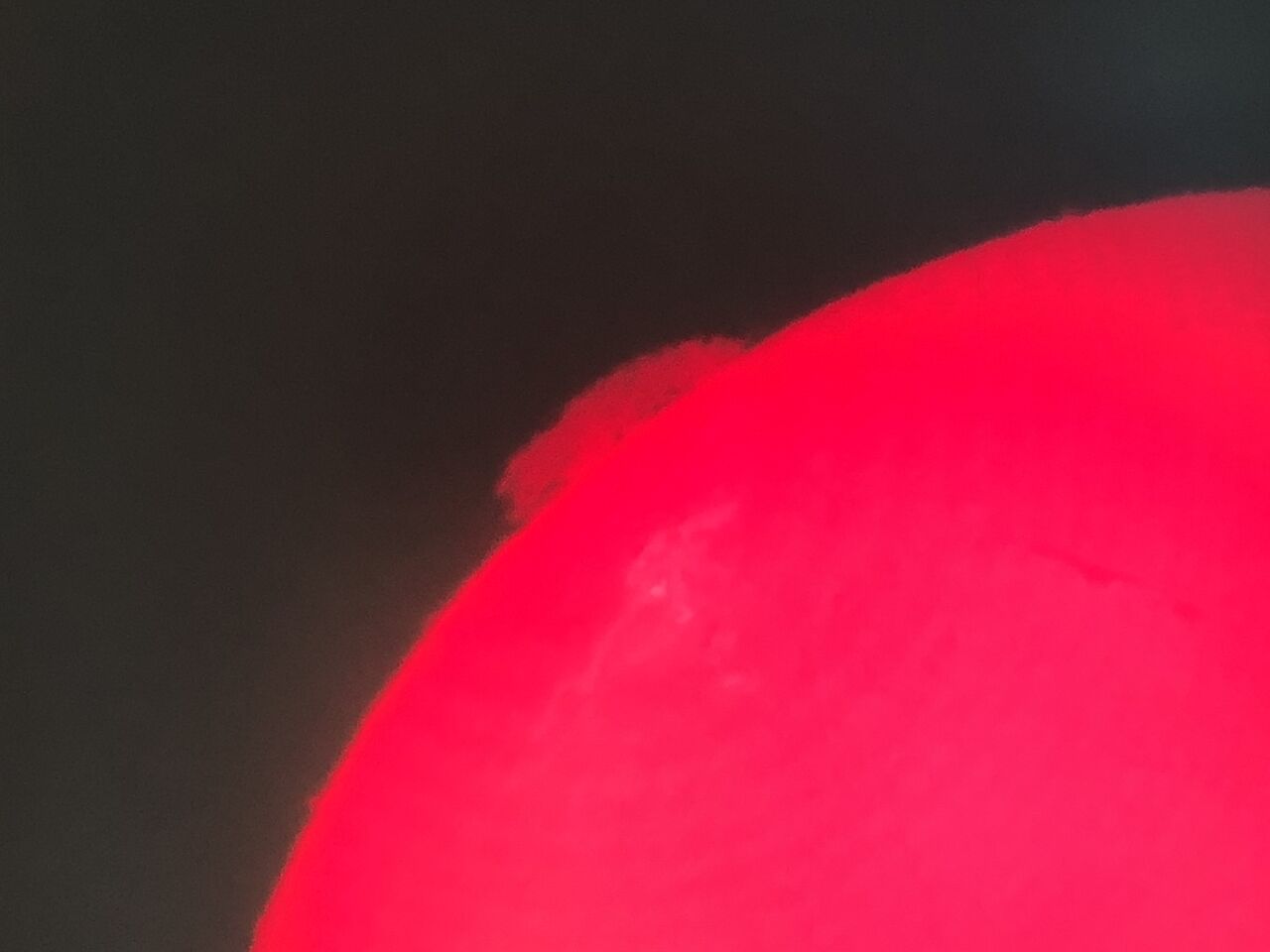この日の太陽面は本当にすごかったですね。周囲の5カ所くらいに巨大なプロミネンスが見え、光球面も派手なダークフィラメントがいくつか。一応ダメ元でスマホコリメート撮影をしてみますが、結局この程度しか写らず。