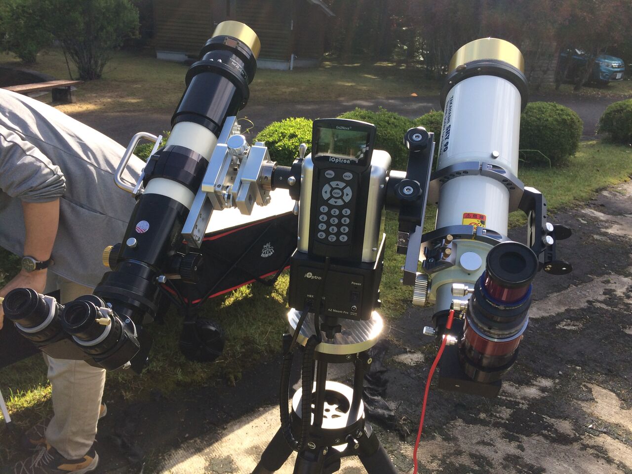 ちなみに下の画像は、昨年、DSP2022開会前の駐車場の模様です。じろーさんのSolorMax90ダブルスタックですね。鏡筒はタカハシSky90だったかな? モデルは確かすぷーんさん。