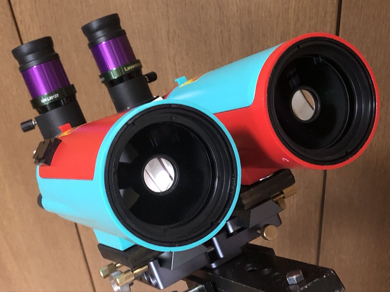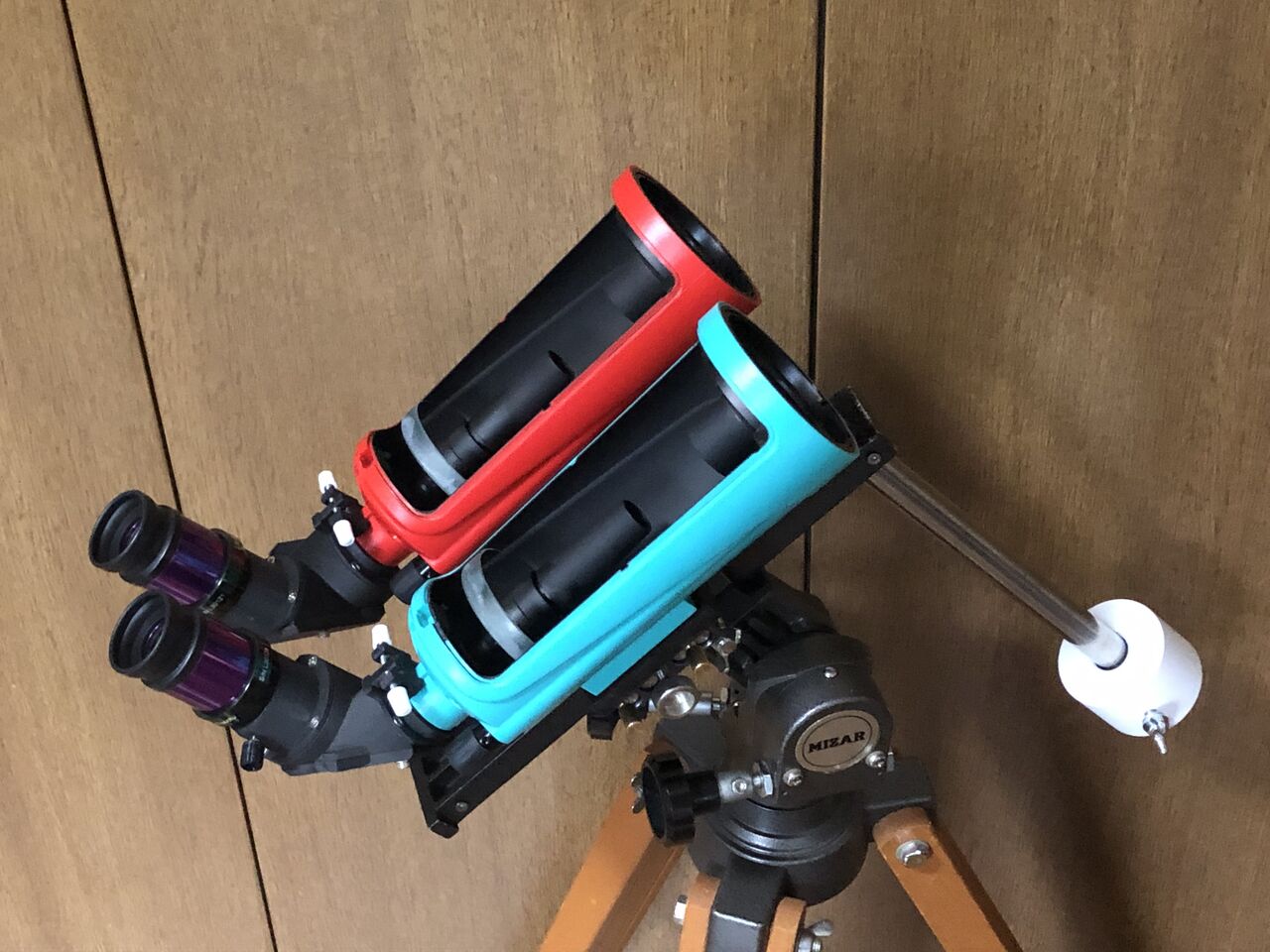 さて、MAKSY双眼はカウンターウエイトを取り付けたミザールのK型経緯台に載せてますが、これがすごく使いやすかったです。あくまでウエイトを追加した「改造状態」ではありますが、ハーフクランプでフリーストップ状態にすると、ぬめーっと動かせてピタッと止まる操作感の良さ! しかもハーフクランプでもしっかり微動が効くし、上下水平ともウォームによる全周微動で巻き戻し不要と来ている! 搭載重量等を抜きにした「操作性」だけで言うと、今まで自分が使ったことある経緯台、ビクセンのカスタム型、HF、ポルタ、五藤のテレパック架台、スコープテックのZERO、などのどれよりも優れています。隠れた名機ですね!