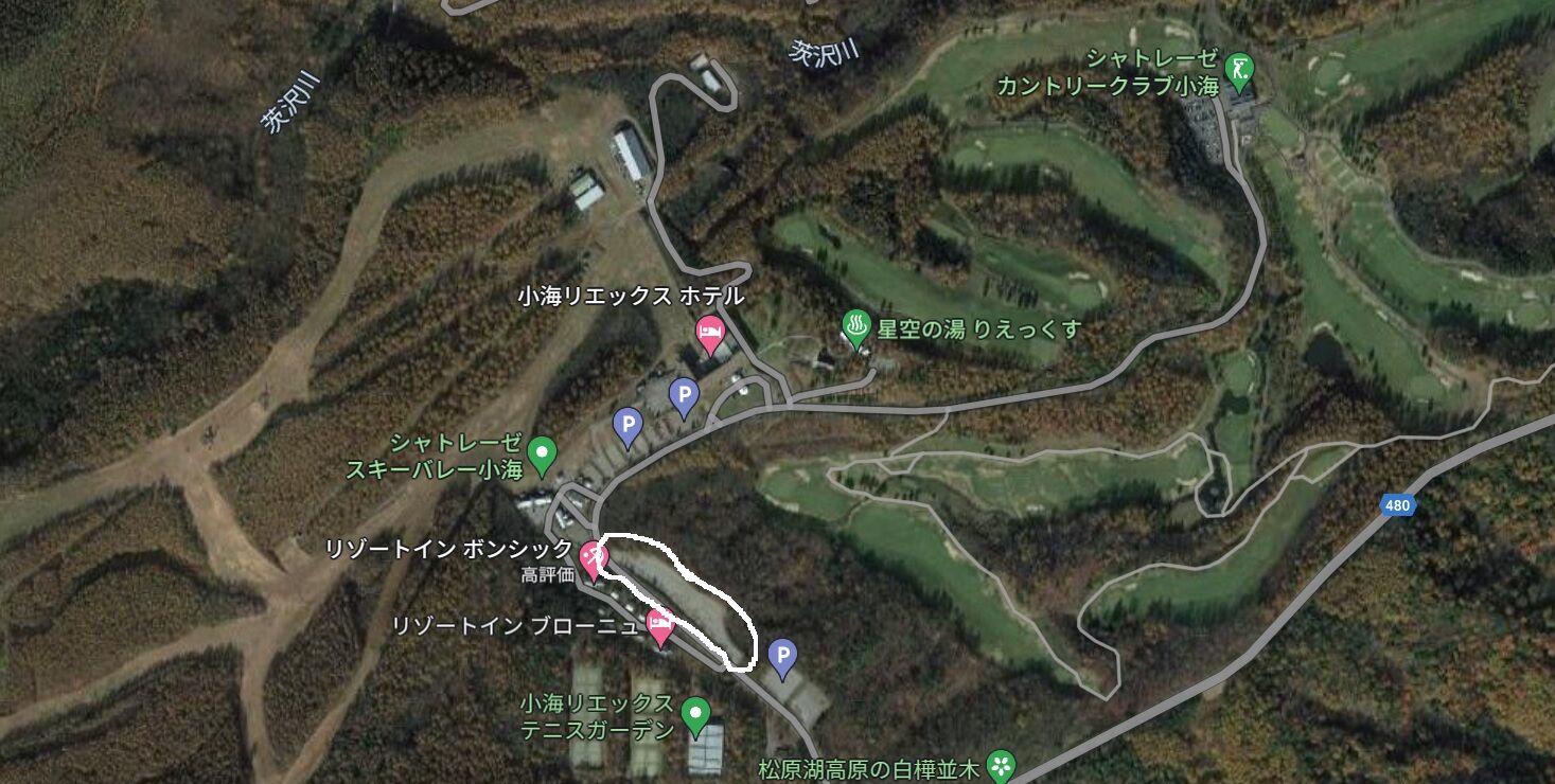 一回メイン会場の「エーデルワイス」方面に車で向かいましたが、ホテル横のトンネル(?)内でホテルの車が搬入作業していて通れず、下の地図の白で〇をつけた部分「第二駐車場」まで戻ります。
