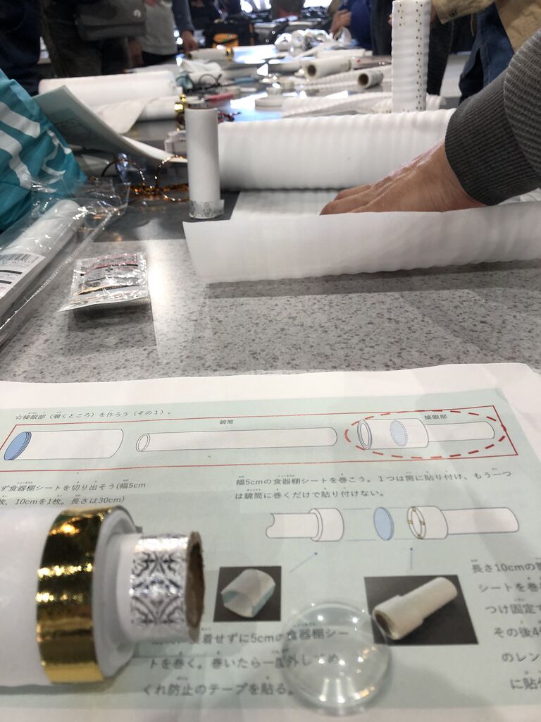 utoさんがこの教室に向けて制作された完全オリジナルのマニュアルが素晴らしく、これに沿っていくだけで老眼鏡などの100円ショップ材料で望遠鏡が作れてしまうという内容になっています。