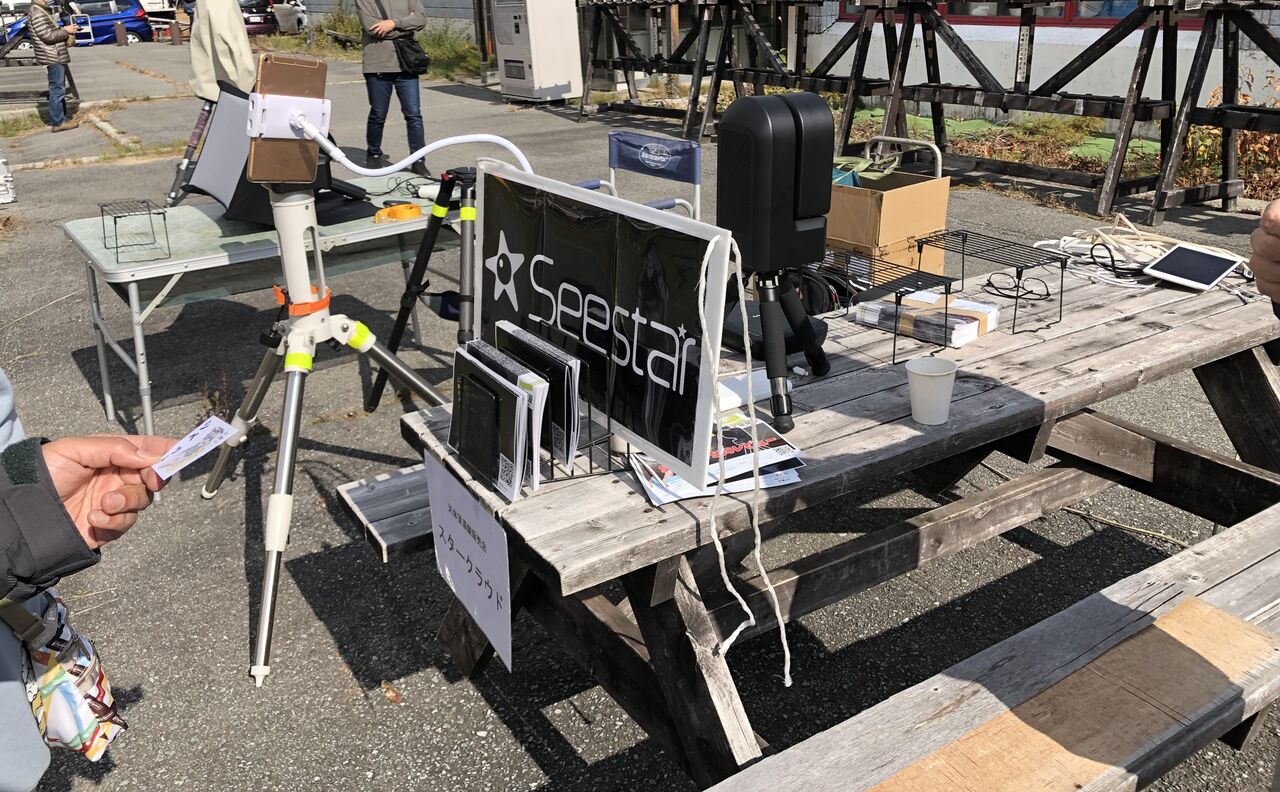 昨日のうちからいくつかの望遠鏡が設置されていました。しかし自分はまだ望遠鏡は出せません。この日は午前11時からメイン会場にてutoさんの「望遠鏡工作教室」をお手伝いすることになっているので、下手に望遠鏡を出してしまうとその場を離れられなり、お手伝いに行けなくなってしまうためです。