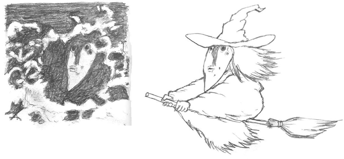 何ですかねー、スケッチがヘボいのが一番の原因なんですが、魔女、と言うよりモアイの顔みたいな(笑)。