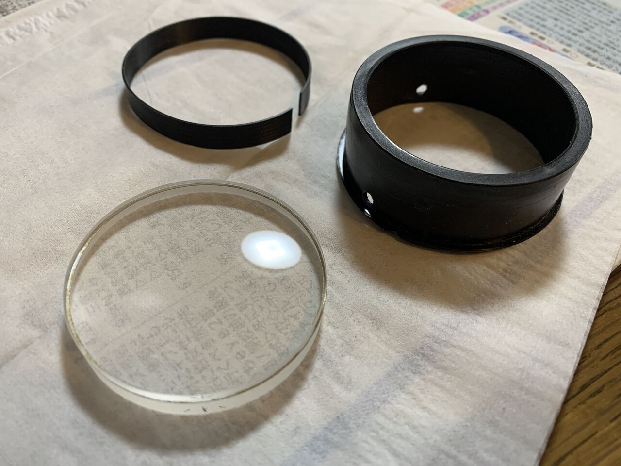 さらにこのレンズは外径∮51.6㎜、ダイナスコープのレンズセル内径は約54㎜なのでそのままじゃセルの中でレンズが動いてカタカタなるから3Dプリンターでスペーサー(左上のやつ)を作りピッタリに納めました。