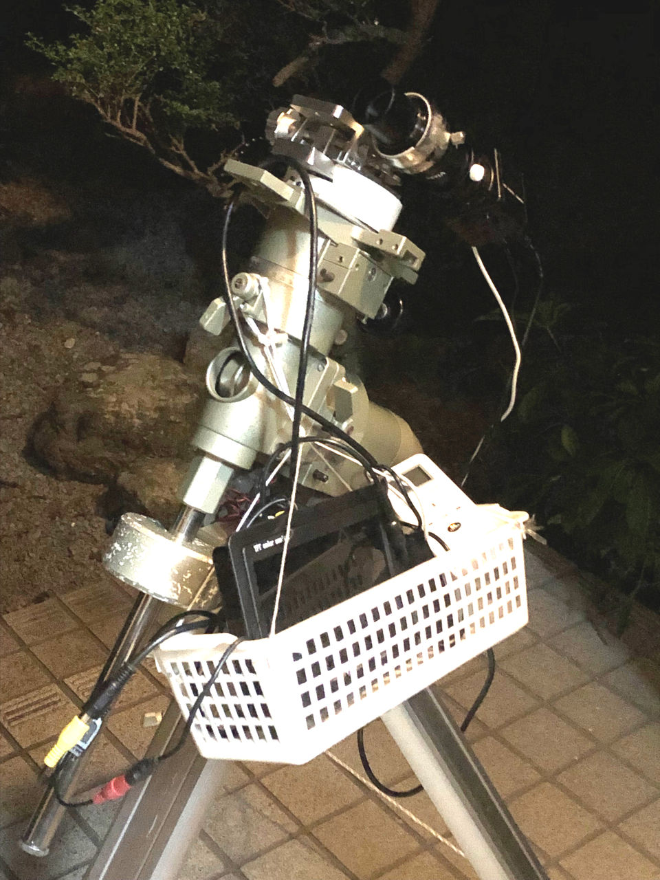 これをSP赤道儀に載せ、かごをぶら下げてモニターやコントローラー、バッテリー等を入れました。