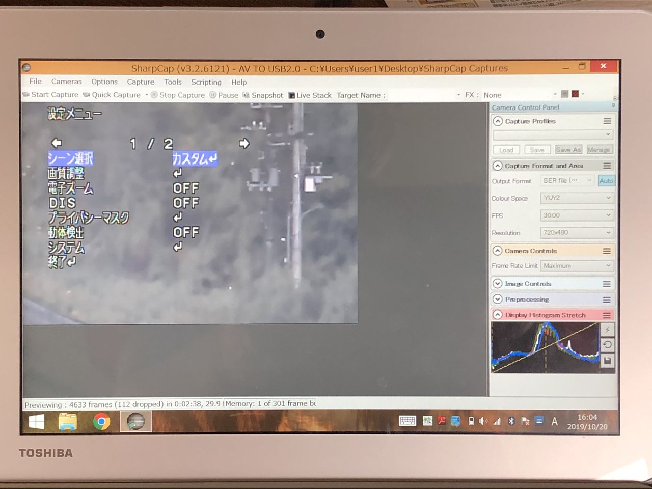 実はこの状態に達するまでに、マイクロUSBアダプタの調達だの、キャプチャアダプタのドライバやSharpCapのインストールがうまくいかないだの、カメラ認識しないだの、などで、丸一日かかり、やっとRevolution Imager R2の操作画面をパソコン画面に写し出すことができました。