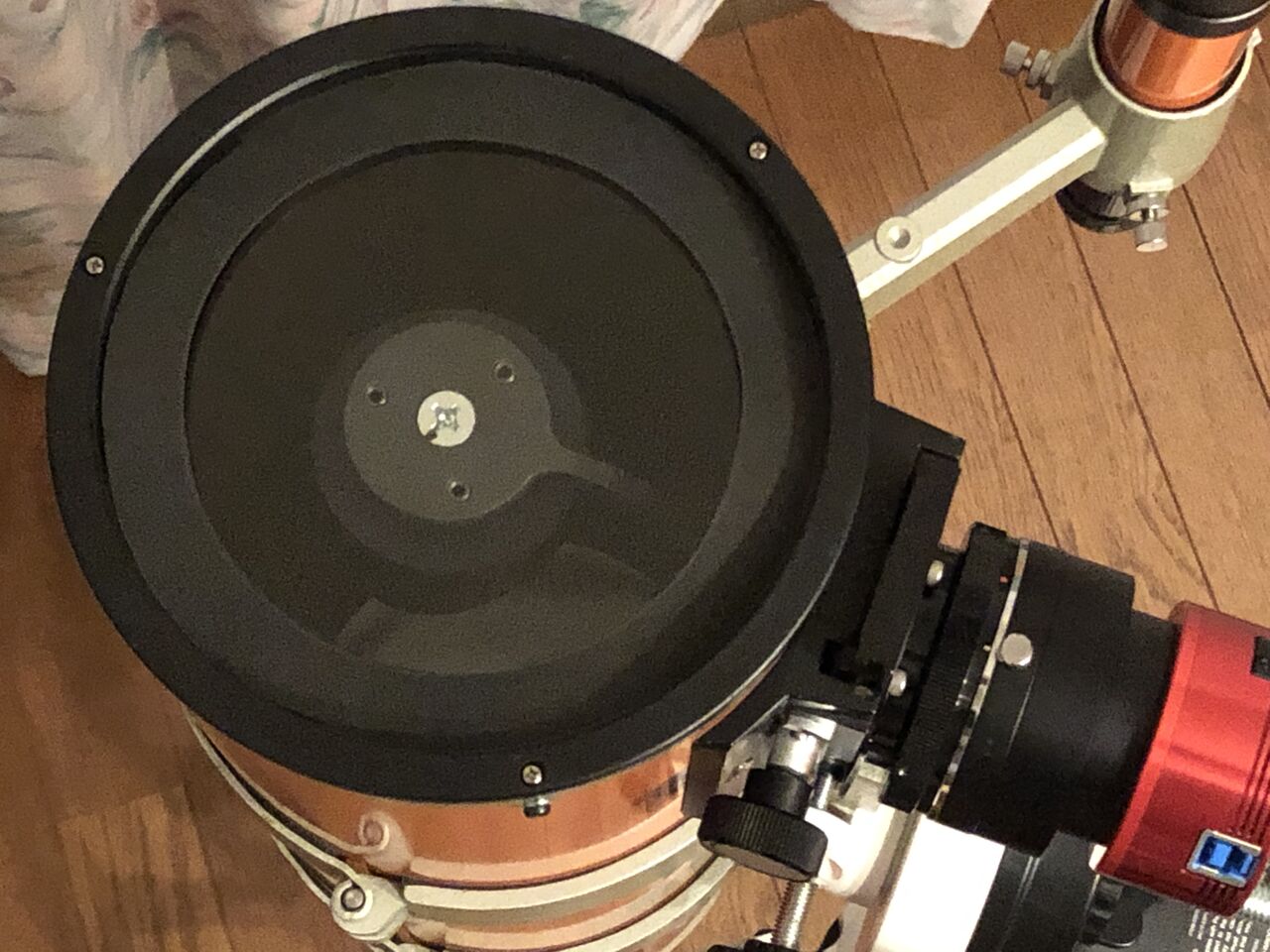 まず、このシュミット・ニュートンは補正板径が140mmのところ、主鏡径が144mmしかないので、単純に言って光量100%のイメージサークルが∮4mmしか取れない計算になります。そこで筒先に∮120mmの絞りを設ければイメージサークルが∮24mmくらいになって、ASI294MCのセンサーサイズ、19.1x13.0mmをフルにカバーできるのではないか、という考えです。