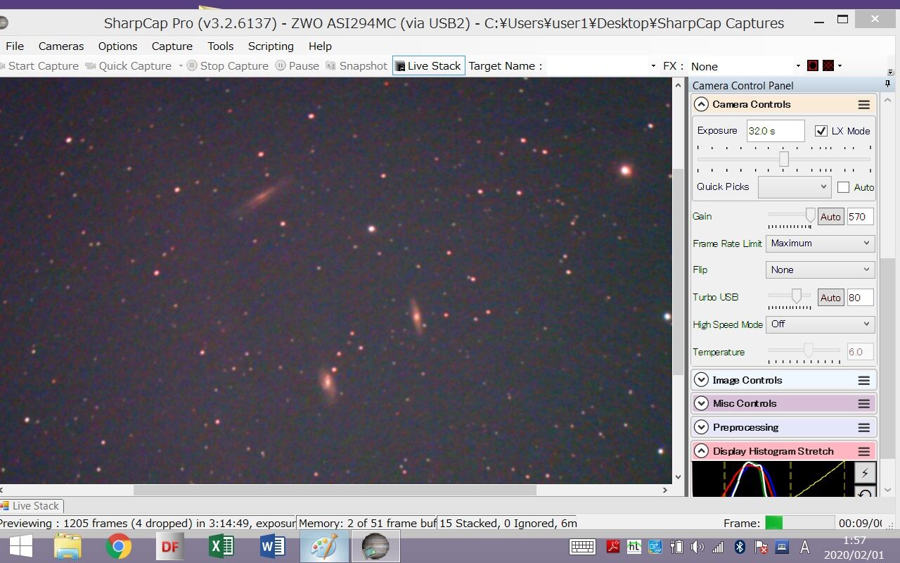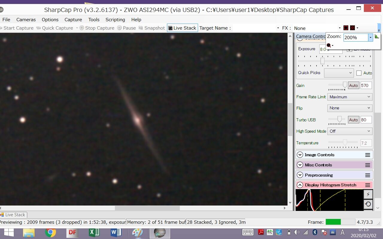 QBPやCLSが8秒露出で充分に小宇宙を表現するのに対し、8秒では中心部しか出ず、32秒の露出時間をかけてやっと、NGC3628の暗黒帯が何とかわかる? くらいになりました。色調も赤っぽく、明らかに不得手な対象と言えます(ただ、STCはQBPよりかなり透過波長域が狭いので連続スペクトルの対象に関してはその分不利であることもあります。それにしても4倍も差が出るものだろうか、という気もしますが)。