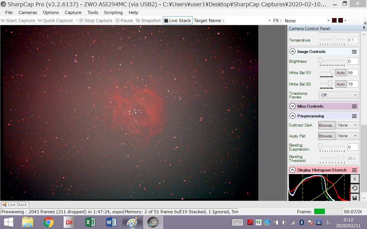 このレンズを210mmにして「Astro Duo-Narrowband Filter + ASI294MC + AZ-GTi経緯台 + SharpCap 」による検証をおこないます。月齢15、肉眼での限界等級2等程度の条件です。