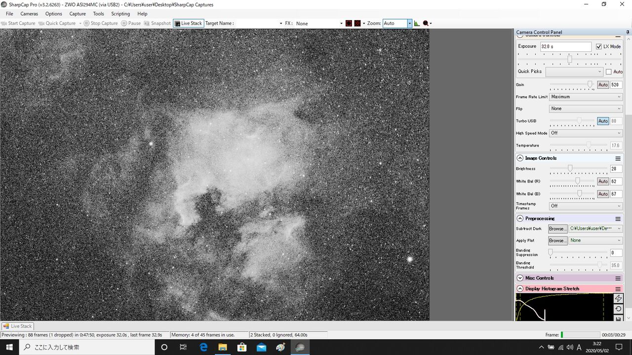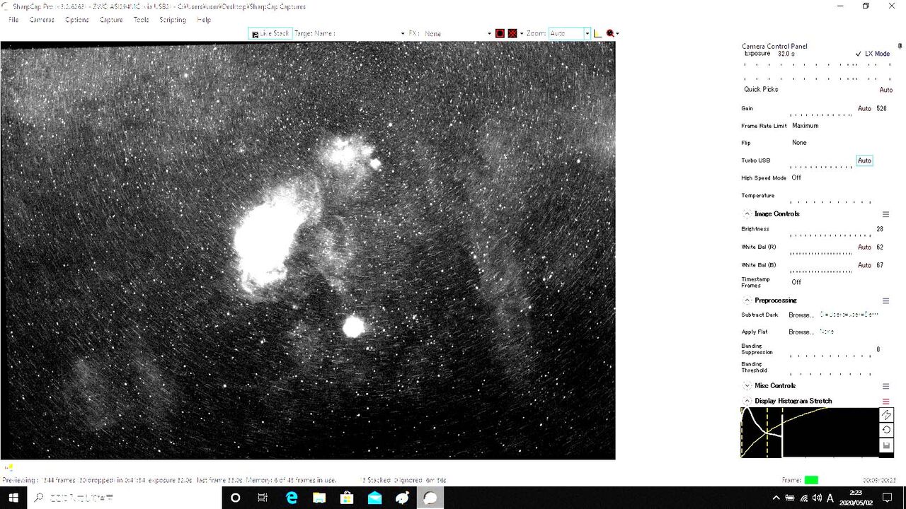これで32秒露出。Hα3.5nmだと暗くなるので、やはりそこそこの露出時間が必要になります。さらに写る星の数が少ないんで、それなりに時間をかけて数をかせいでやらないと、Sharpcapのlivestackが成功しないのです。