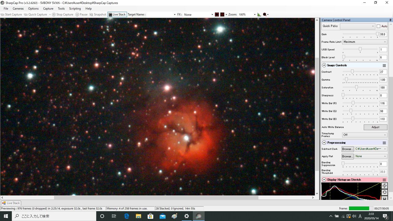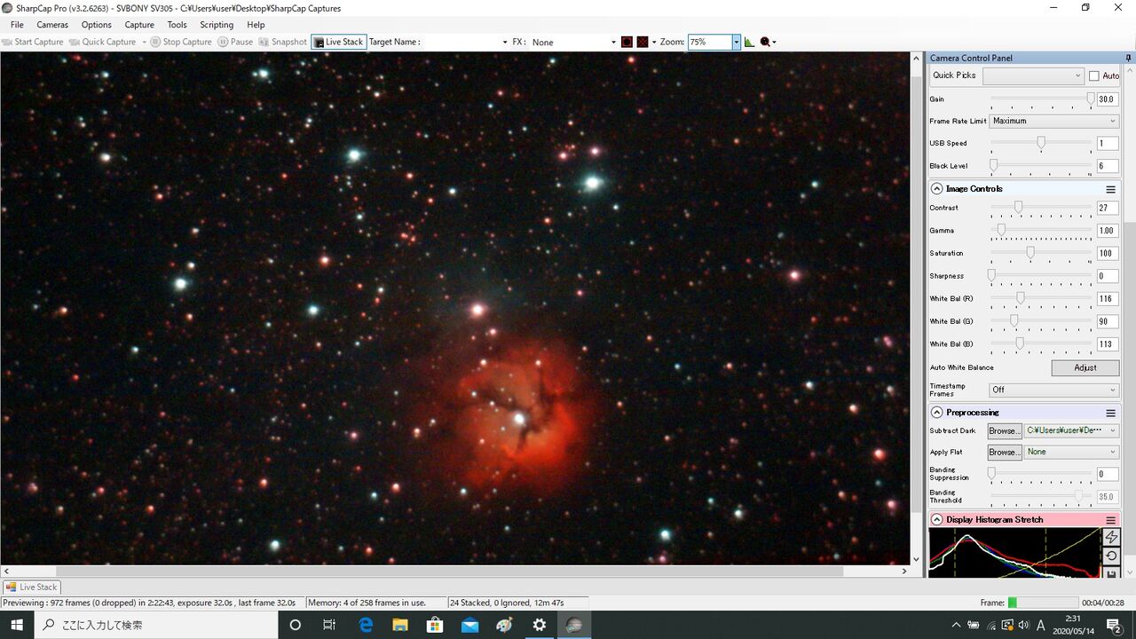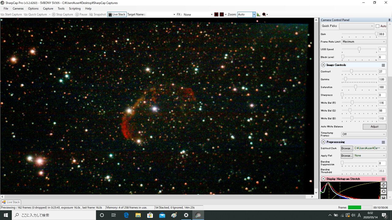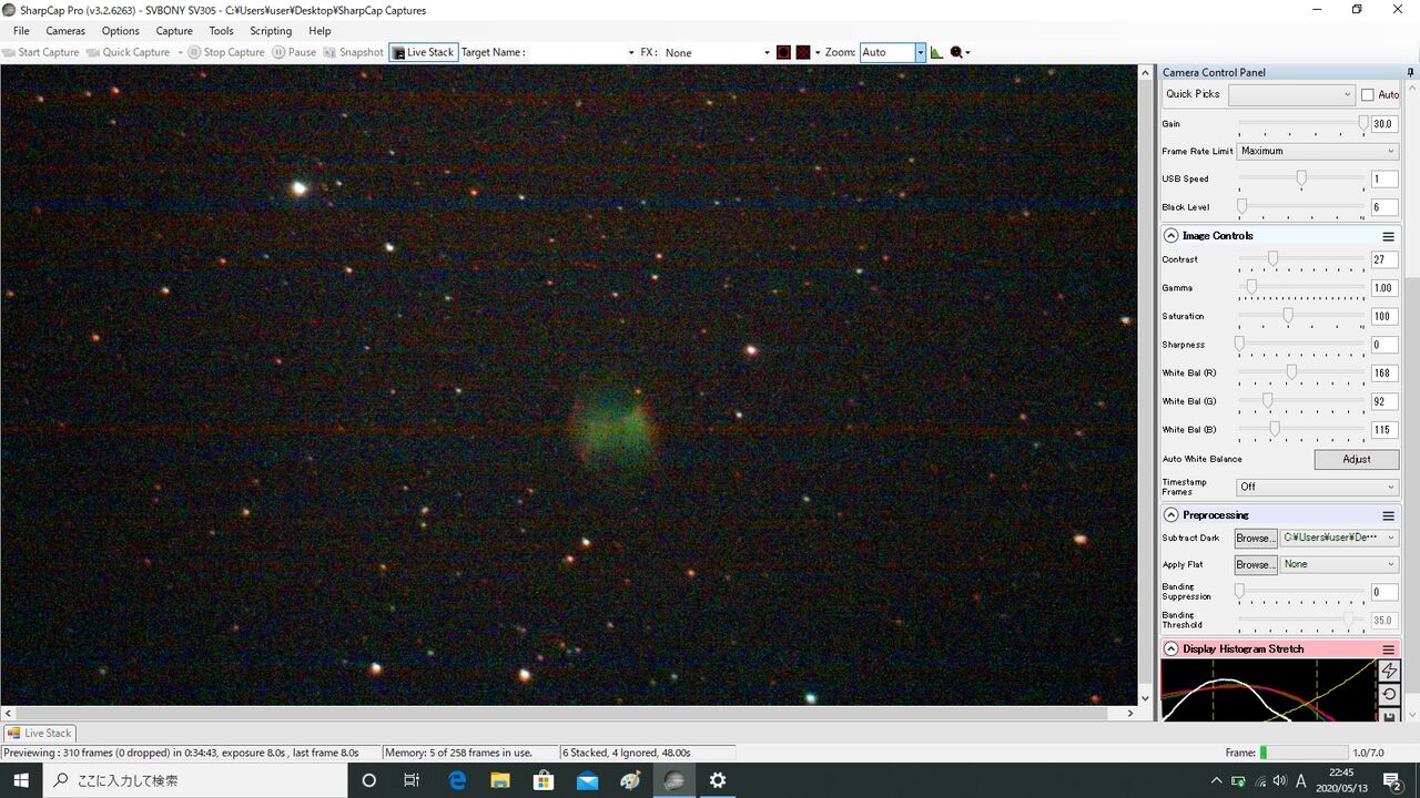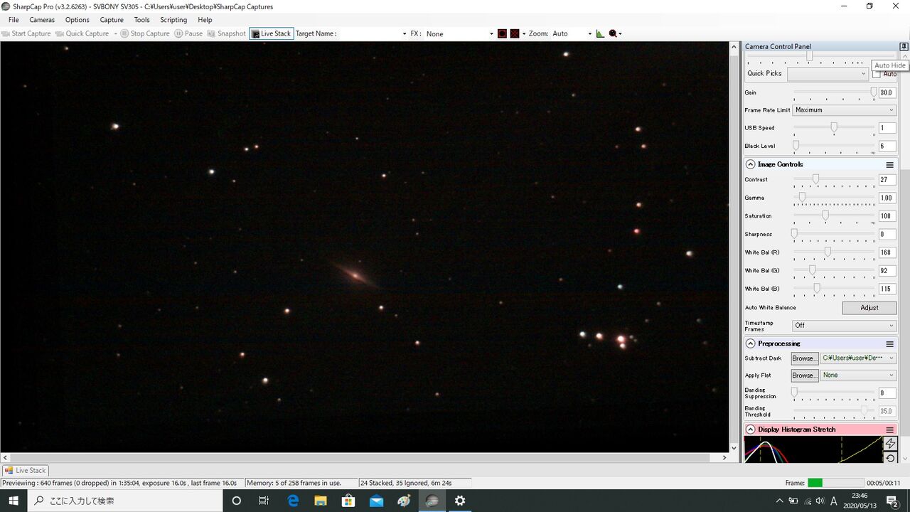 あ、まあ悪くないですね。視野内に星が少ないのですが、なんとか24スタックできました(35イグノア)。銀河の場合、フレーム・アラインが成功するかどうかが問題になりますね。ちなみに、この後、M51にも行ったのですが、どうしてもLiveStackが成功せず断念。