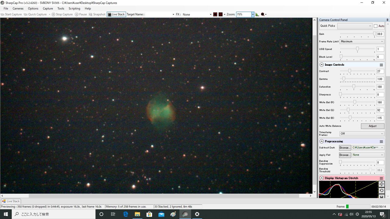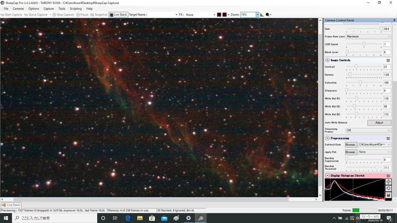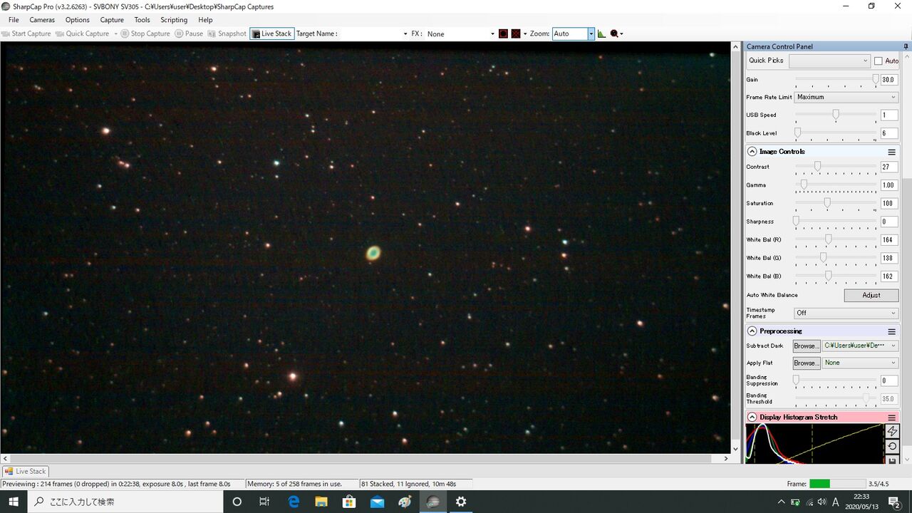 輝度の高いM57は写ってはいますけど、星の写りが少なくて認識しないのかフレーム・アラインができないんですね。仕方ないのでフレーム・アラインを切ってLiveStack6枚。星を追わずに画面の同じ位置をコンポジットするだけなので、これ以上やるとズレます。そしてもちろん横縞ノイズは健在。