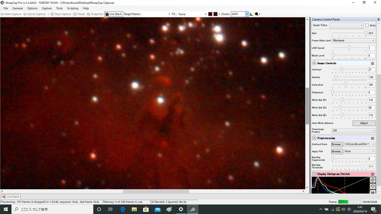 ・・・・! こっちの方が断然星の数が多い! これはノーマル機と比べて感度が相当高い感じがします。で、もちろんフレーム・アラインができるので、Livestackの枚数を増やすことで、横縞ノイズも出てはいるのですがかなり目立たなくすることができます! 調子に乗って81スタックもしてしまいましたので厳密な比較ができないのですが、とにかく高感度な印象が残りました。