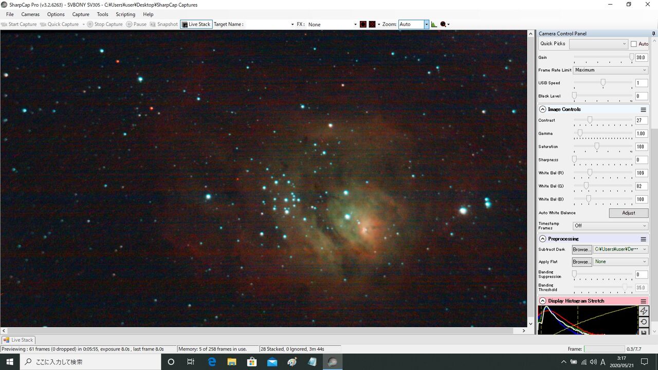 デジタル一眼(初代キスデジ)のIRカットフィルターもHαを1/5程度に減衰させていたのですが、SV305ではデジタル一眼のIRカットフィルターに近いものを採用し、同じような現象が起こっているのかも知れません。一般撮影や月・惑星のカラーバランスを考慮した仕様になっているのでしょうか。