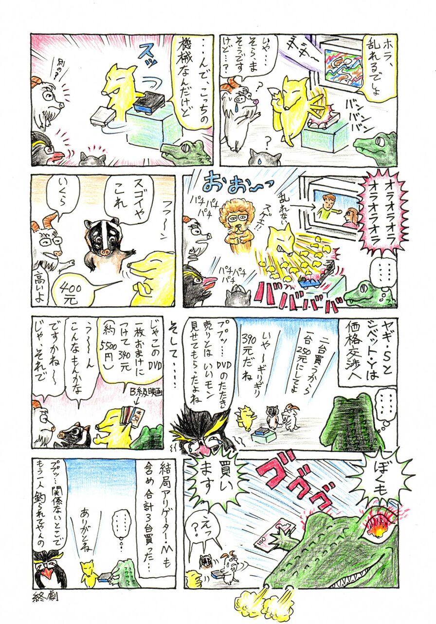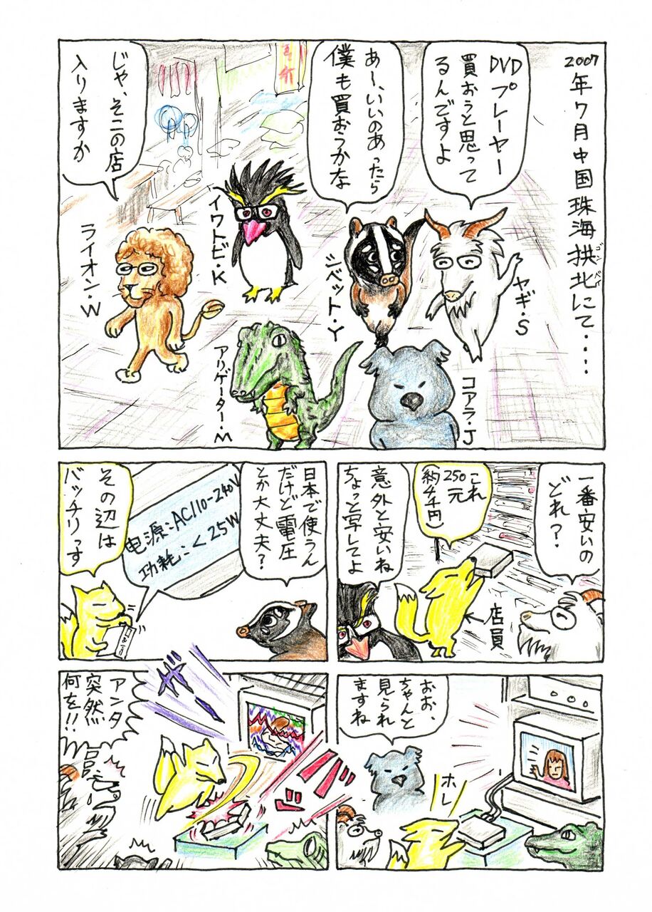 話は変わりますが、中国経済特別区・珠海市での買い物の様子を、自分をハクビシン(シベットY)、当時の仲間も他の動物に見立てて描いた漫画を載せておきますので、ご笑覧ください。