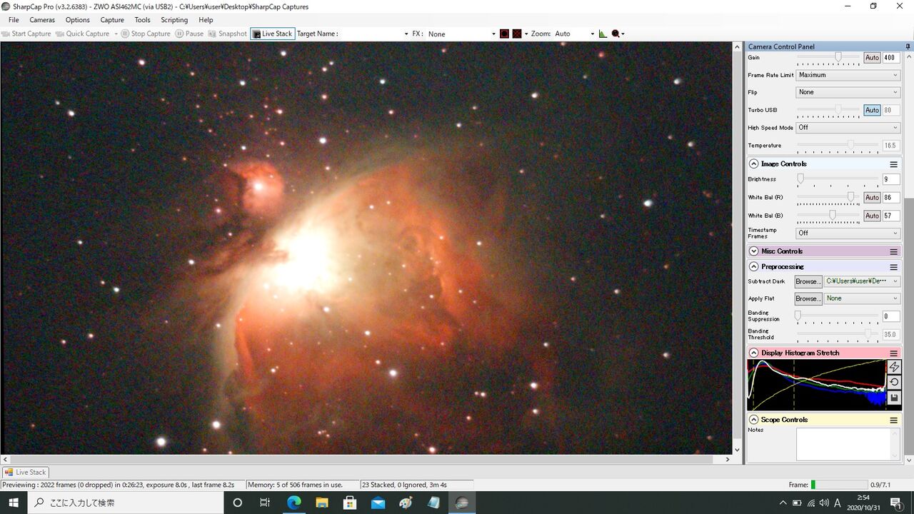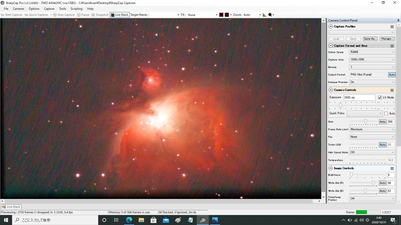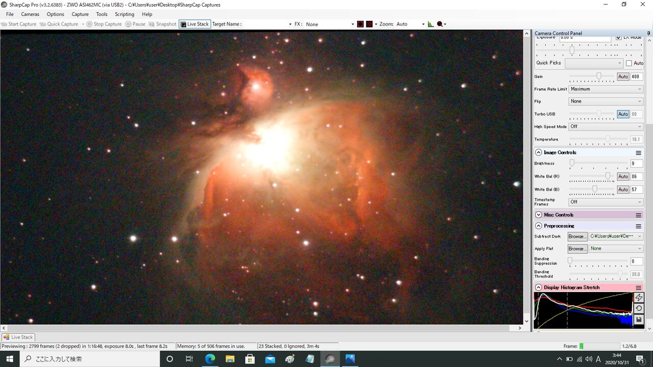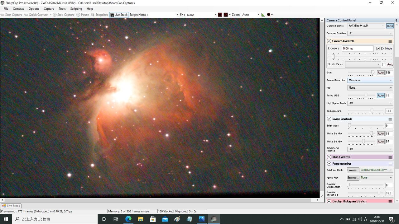 対象はM42。最初ASI462MCの最大Gainである600から始めようとしたのですが、この状態では1秒露出でもライブスタックが成立せず(月光によるバックグラウンドのカブリの影響?)。550からスタートしました。