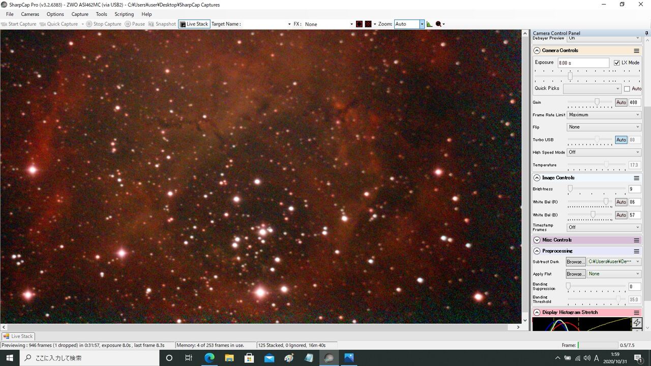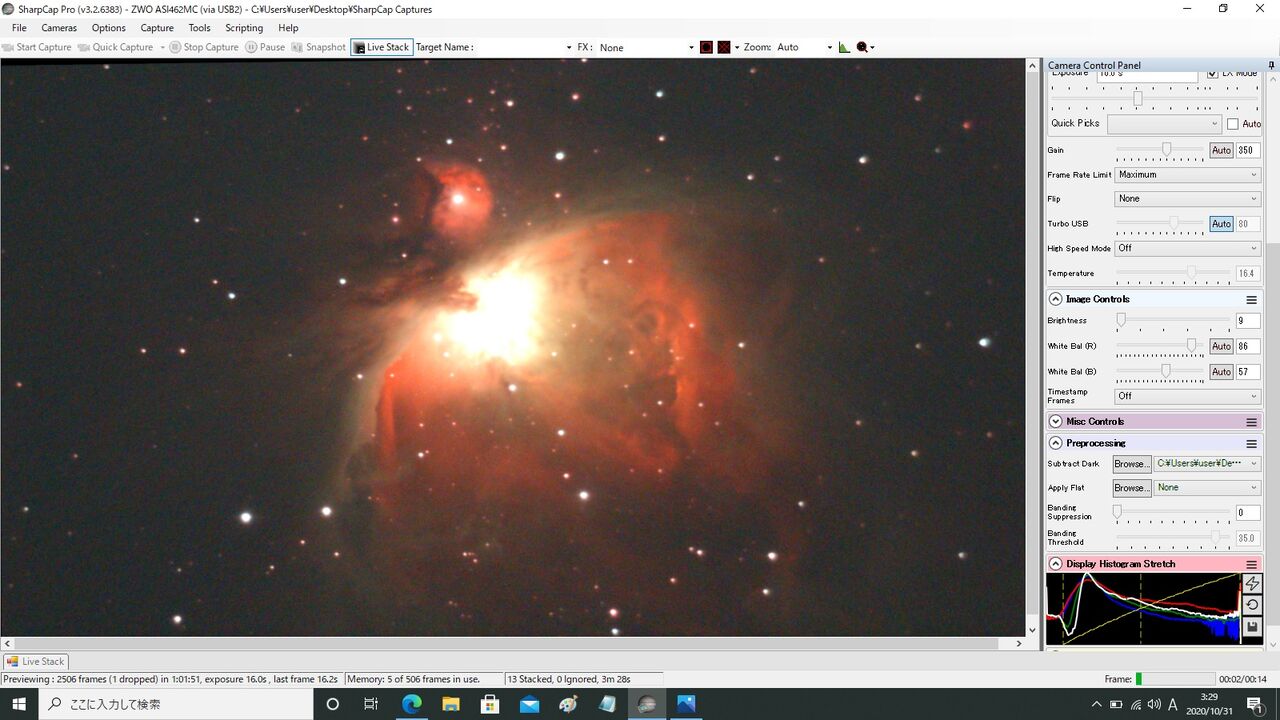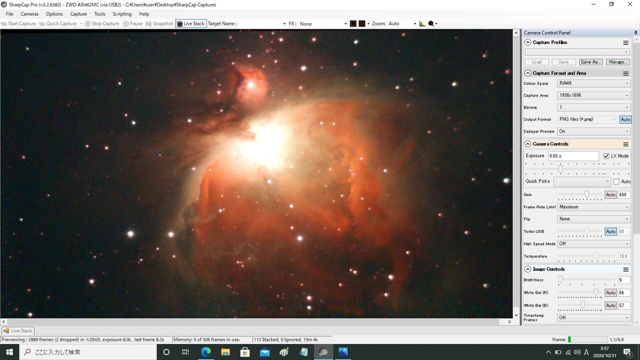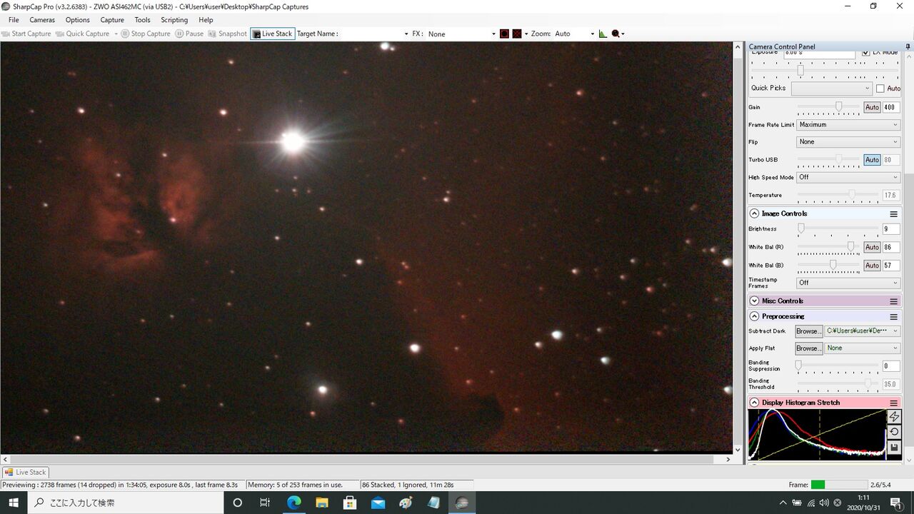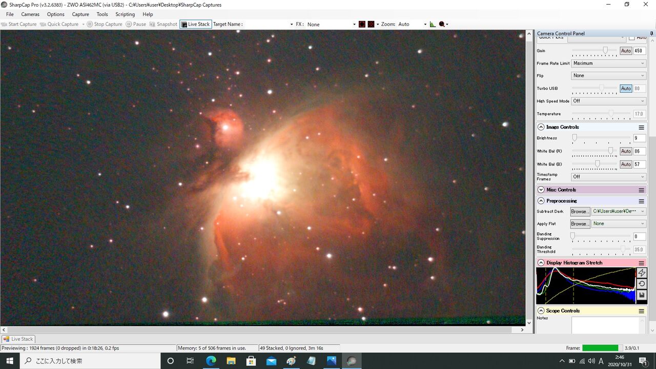 対象はM42。最初ASI462MCの最大Gainである600から始めようとしたのですが、この状態では1秒露出でもライブスタックが成立せず(月光によるバックグラウンドのカブリの影響?)。550からスタートしました。