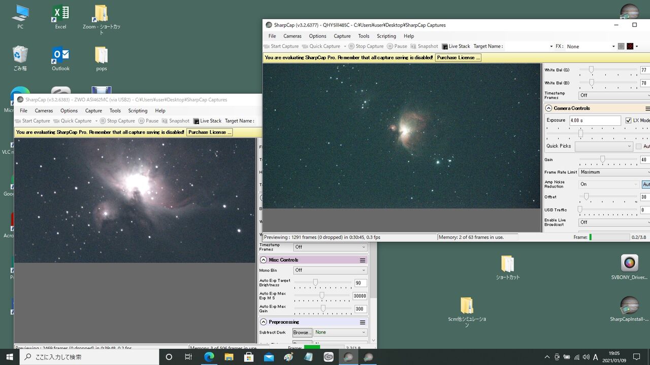 2つのCMOSはそれぞれSharpCapのウィンドウを開いて画像処理。このような画面になります。