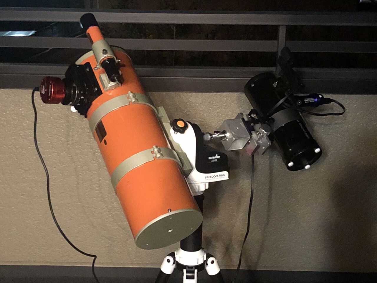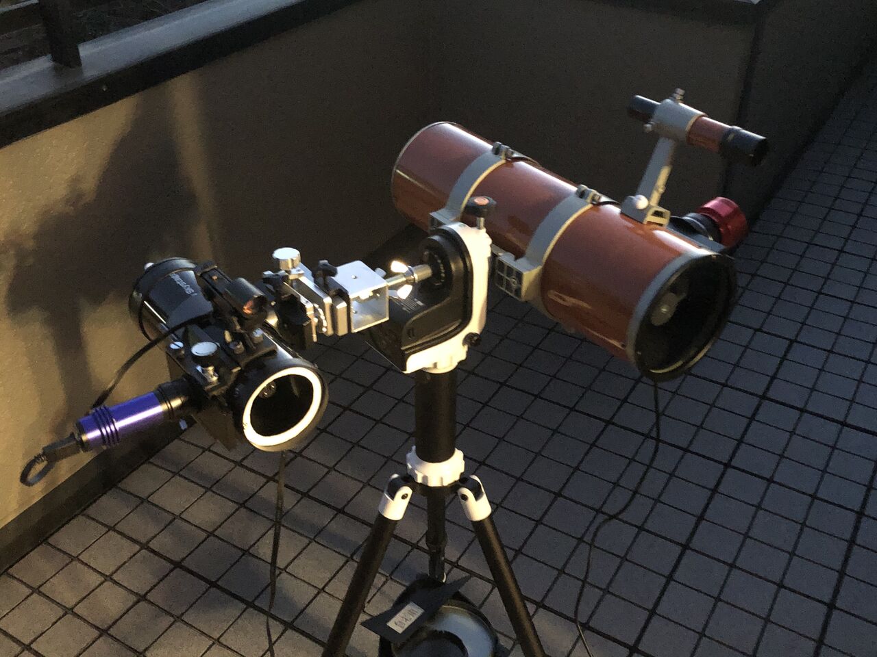 まず、左右の鏡筒の光軸を合わせるのが、かなり微妙な操作が必要で時間がかかる、さらに「広視野システム」のほうが長いズンギリボルトの先にありますので、たわみの影響で天体の仰角により「電視ファインダー」の向きが少しずれます。今回、自宅ベランダでの運用なので、その辺は時間をかけて取り組めましたが、出先の観望会などでの運用は難しい印象です。